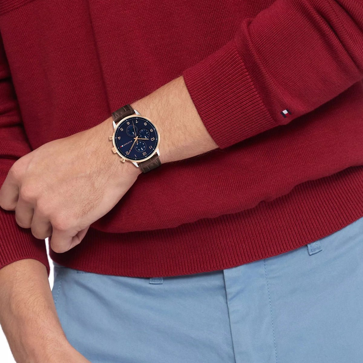 Nice men’s watch from the world-renowned fashion brand Tommy Hilfiger. The watch has a quality leather strap in brown which goes well with the dial in blue with the highlighted markings. The watch has three chronographs. All in all, this is a nice men’s watch that can be used both for everyday use, but also for more festive occasions. The watch measures 44 mm in diameter and is water resistant down to 5 ATM.Â