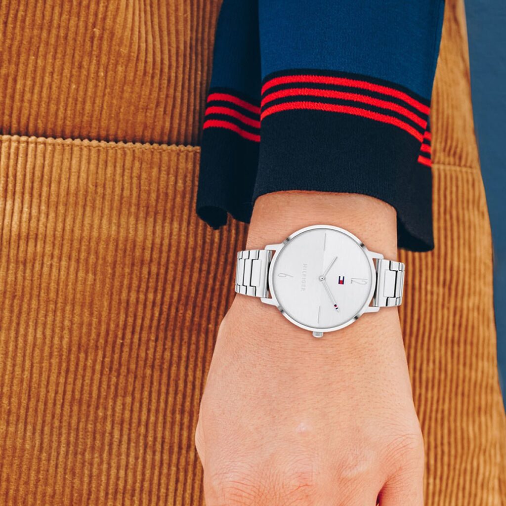 This Tommy Hilfiger watch has a stainless steel case 40mm in diameter and is fitted with a metal strap. Inside the case lies a movement and the watch features a mineral crystal.
