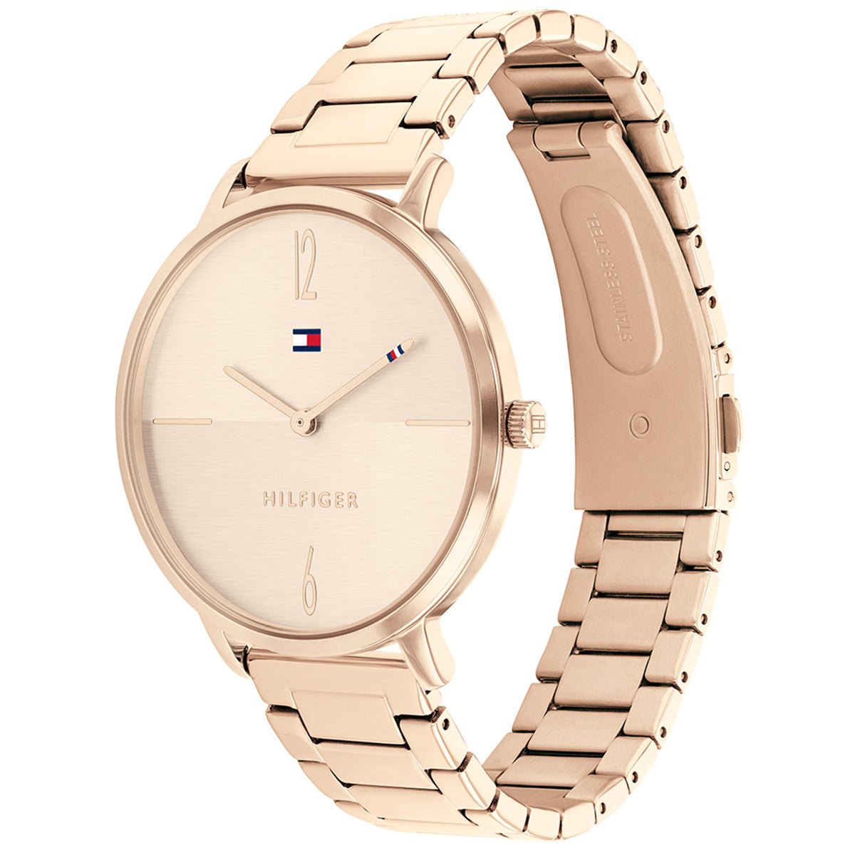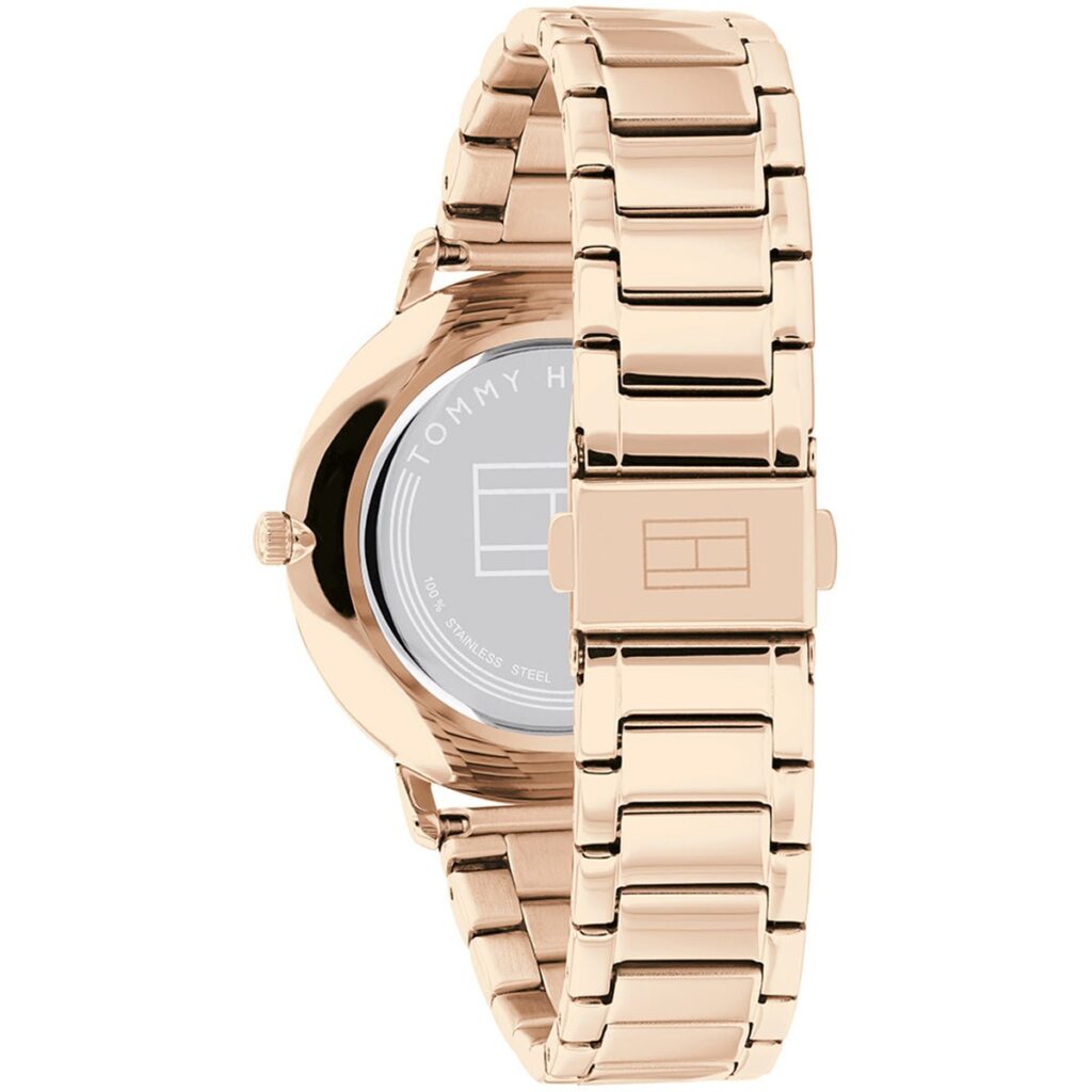 This Tommy Hilfiger watch has a stainless steel case 40mm in diameter and is fitted with a metal strap. Inside the case lies a movement and the watch features a mineral crystal.