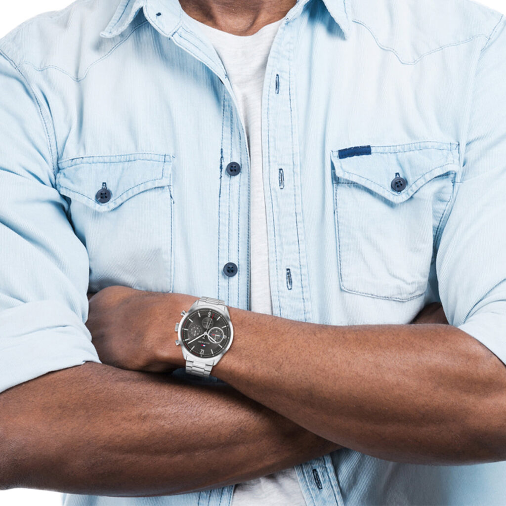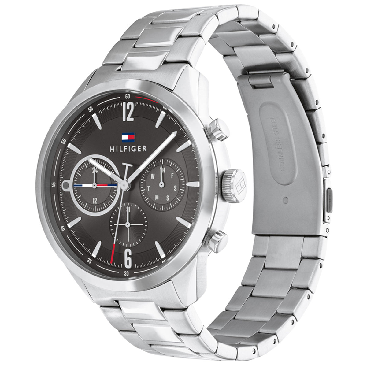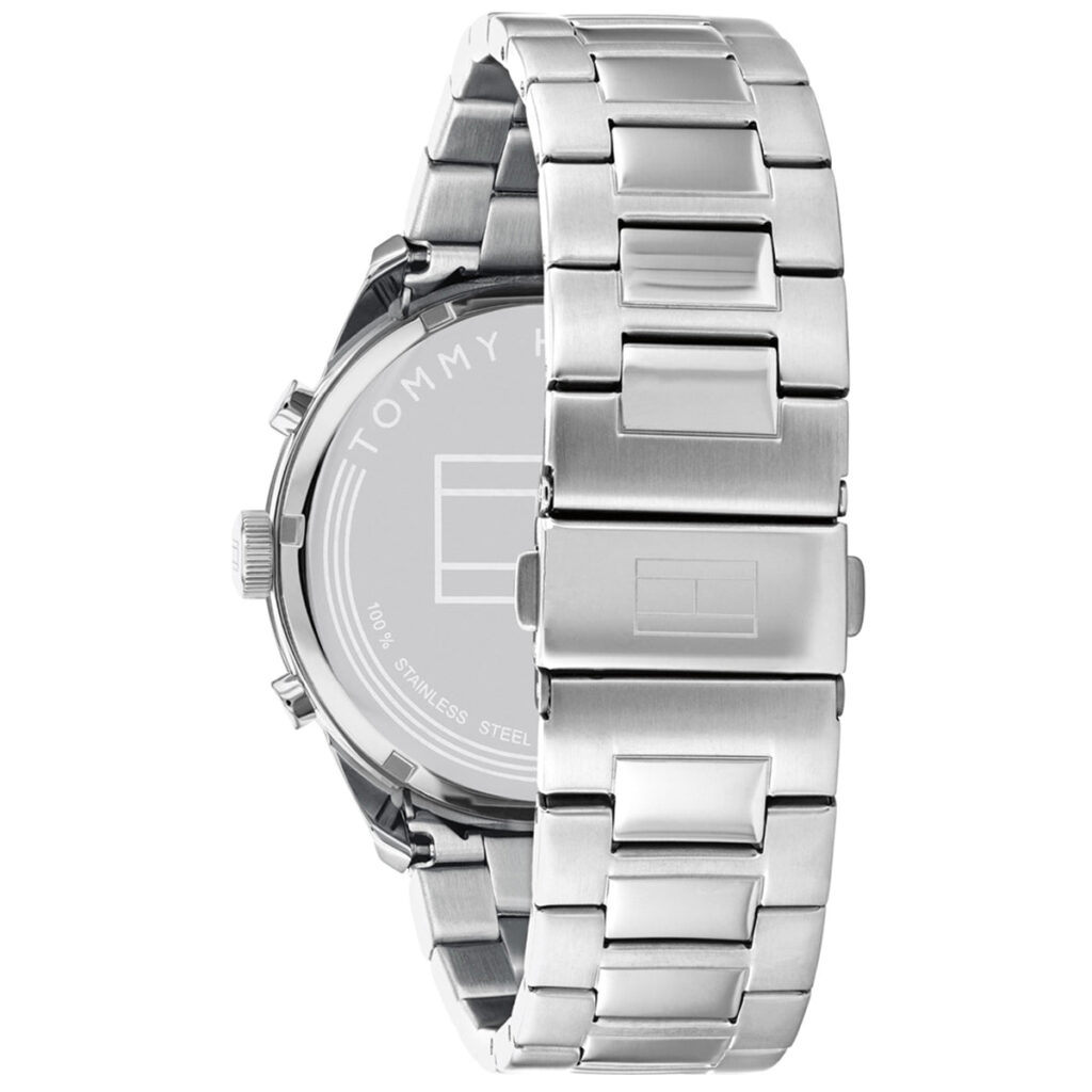 This Tommy Hilfiger watch has a stainless steel case 44mm in diameter and is fitted with a metal strap. The watch case contains a movement and a mineral crystal.