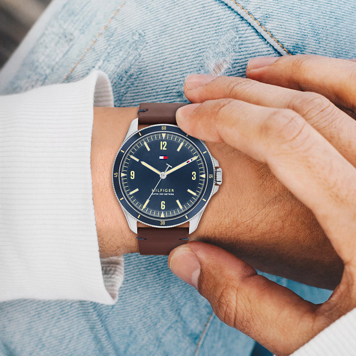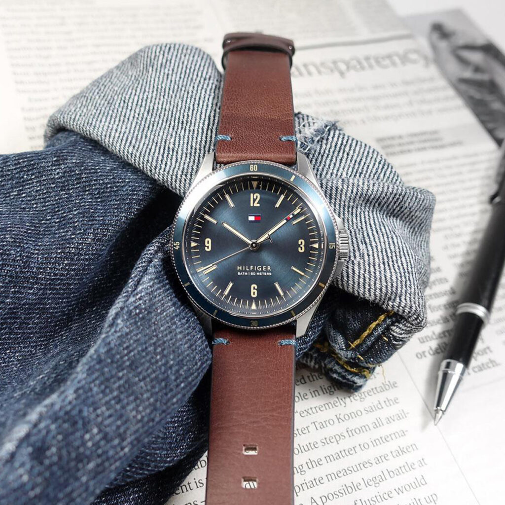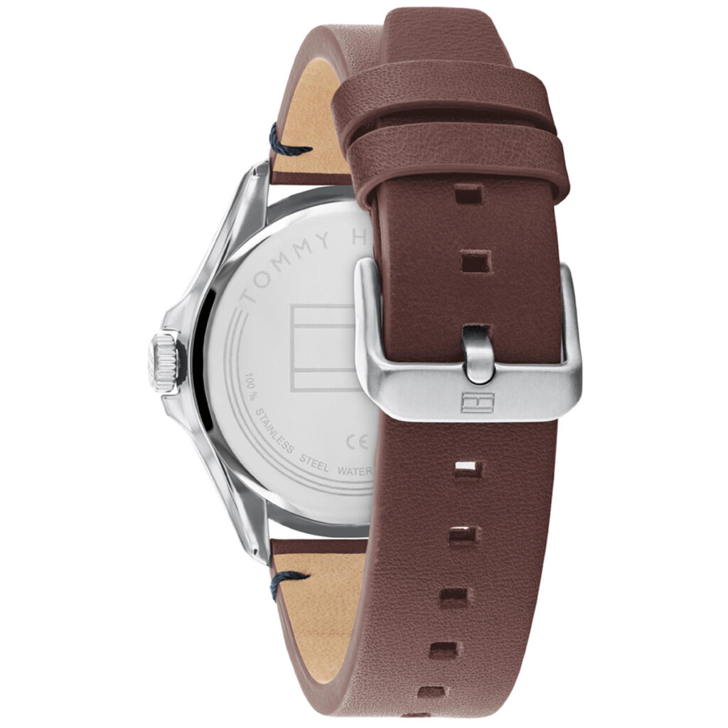This Tommy Hilfiger watch has a stainless steel case 43mm in diameter and is fitted with a leather strap. Inside the case lies a movement and the watch features a mineral crystal.