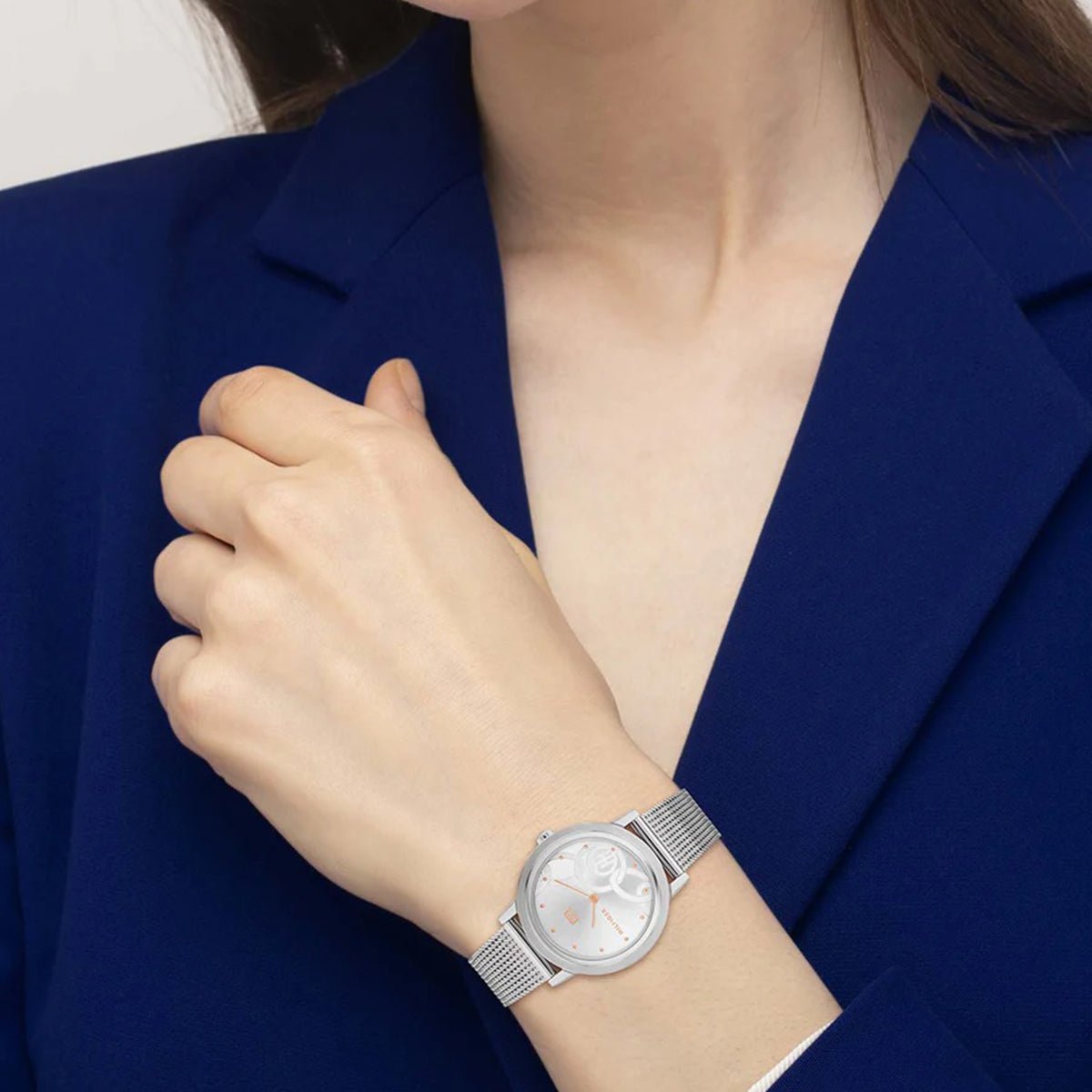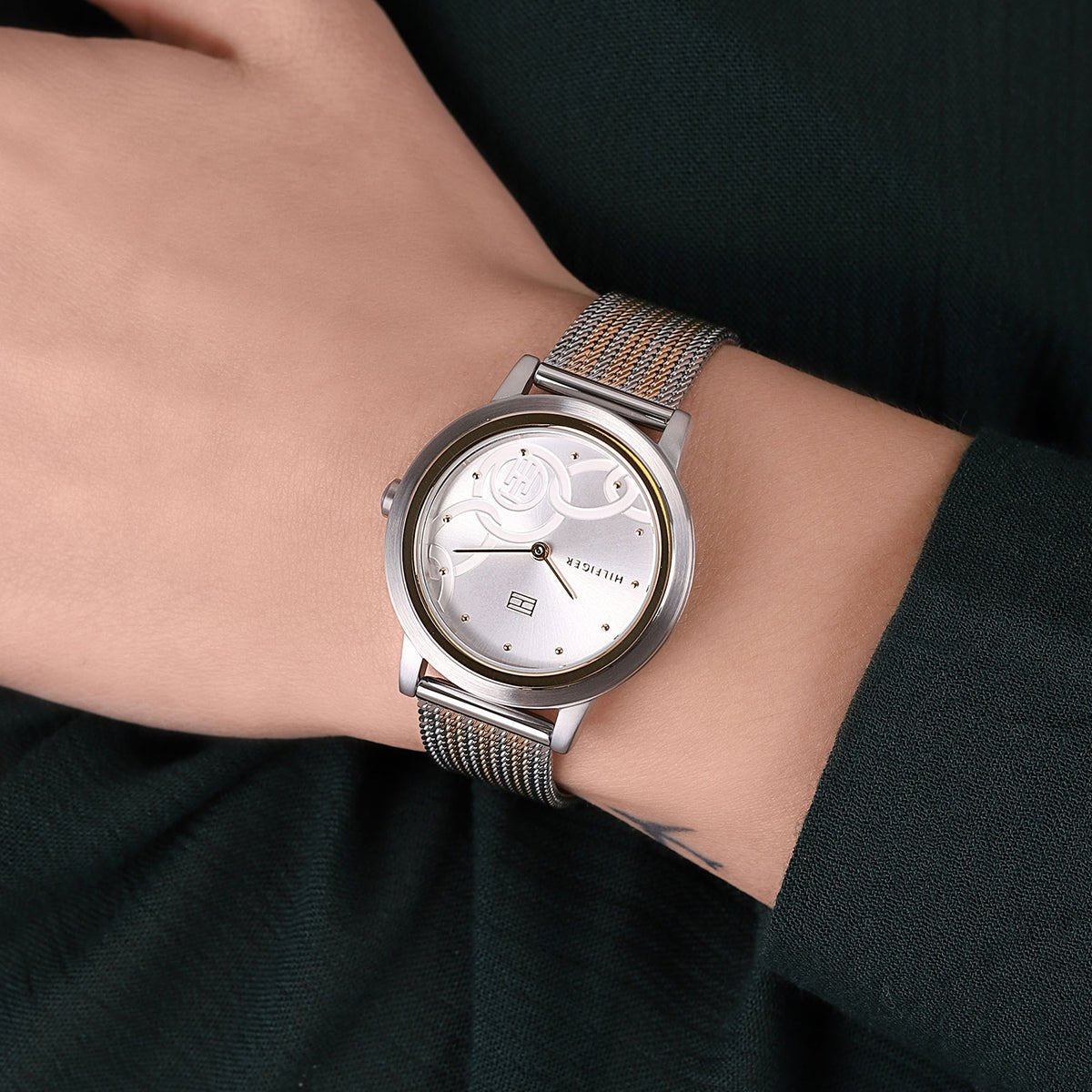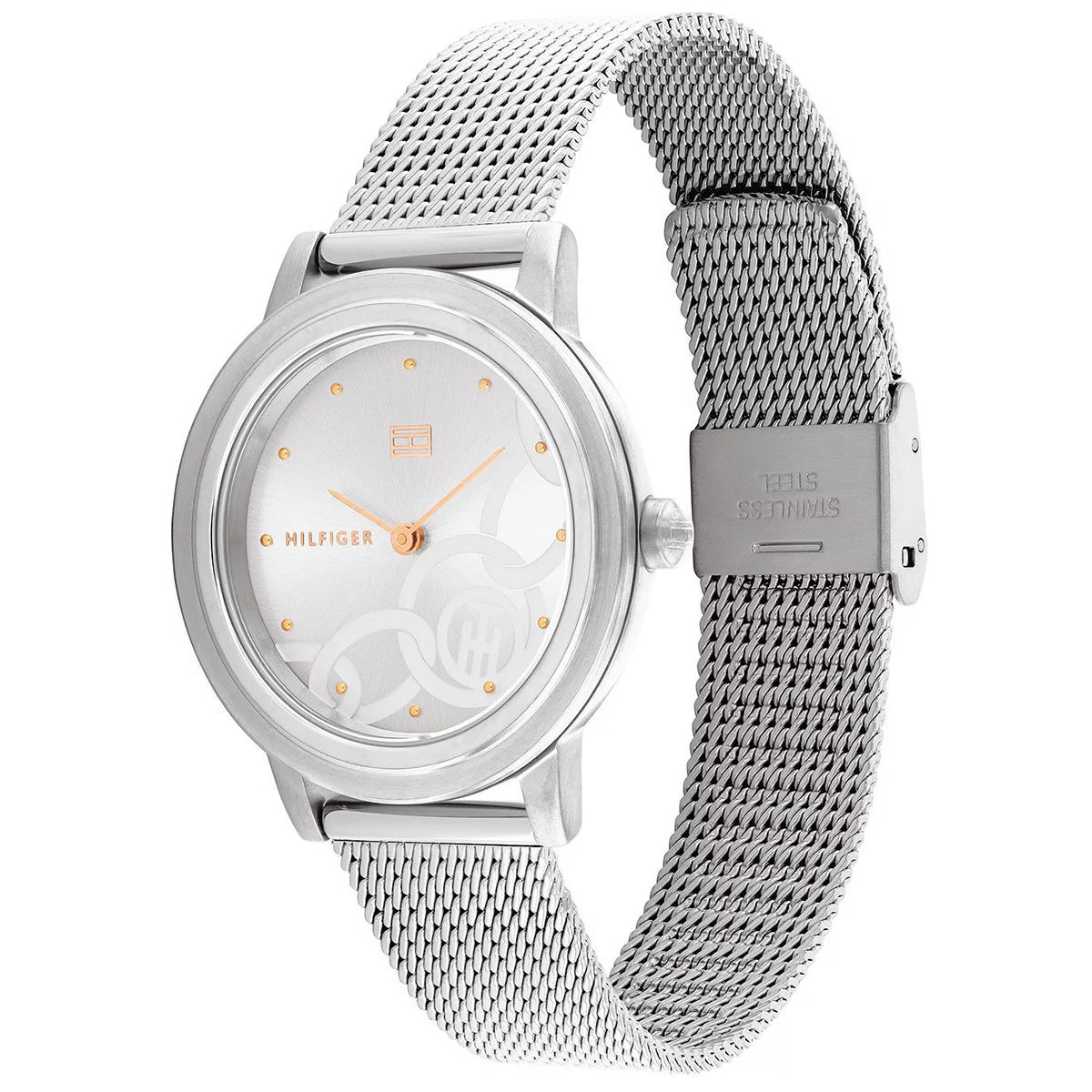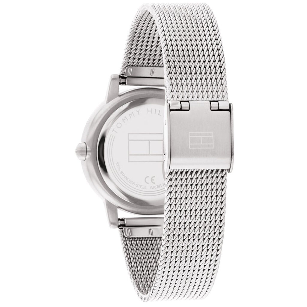 This Tommy Hilfiger watch has a stainless steel case 34mm in diameter and is fitted with a metal strap. Inside the case lies a movement and the watch features a mineral crystal.