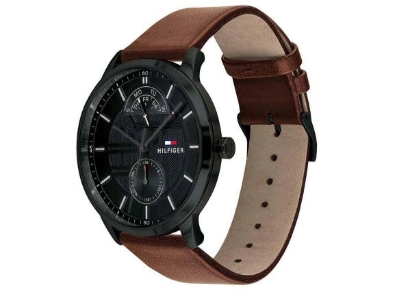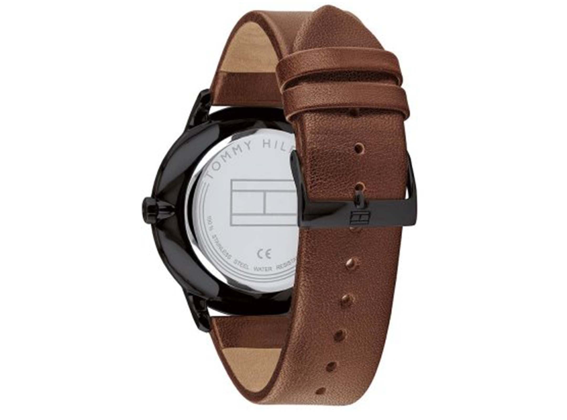 Tommy Hilfiger men’s watch. Perfect timing, indeed. Our latest timepiece features an ion-plated case and light brown leather strap with a sleek black dial. Made complete with date and time sub-dials, three-hand movement and our iconic Tommy flag.