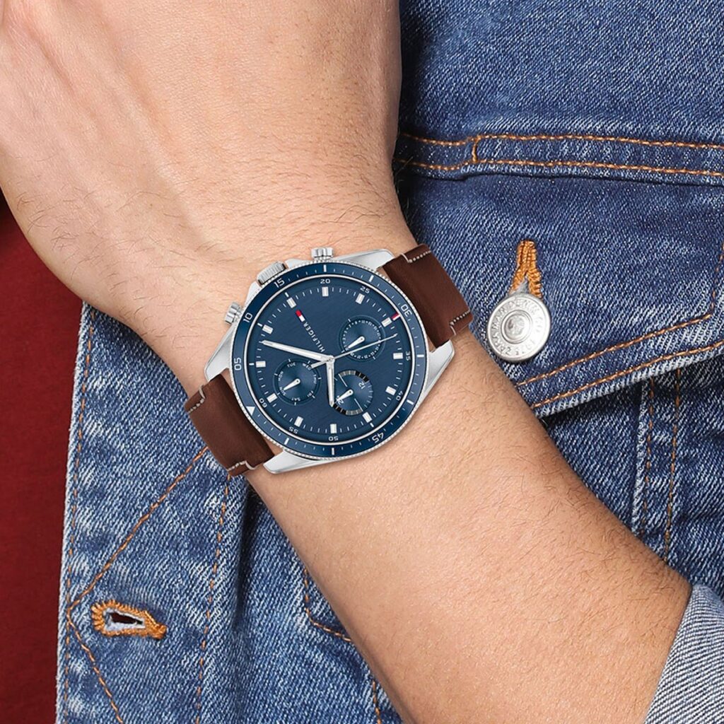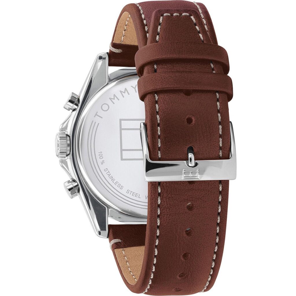 Tommy Hilfiger men’s watch. Sophistication and perfect timing, all in one roust handsome timepiece set within a stainless steel case with a trio of sub-dials and brown, stitched leather strap.