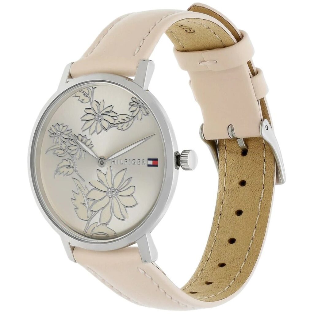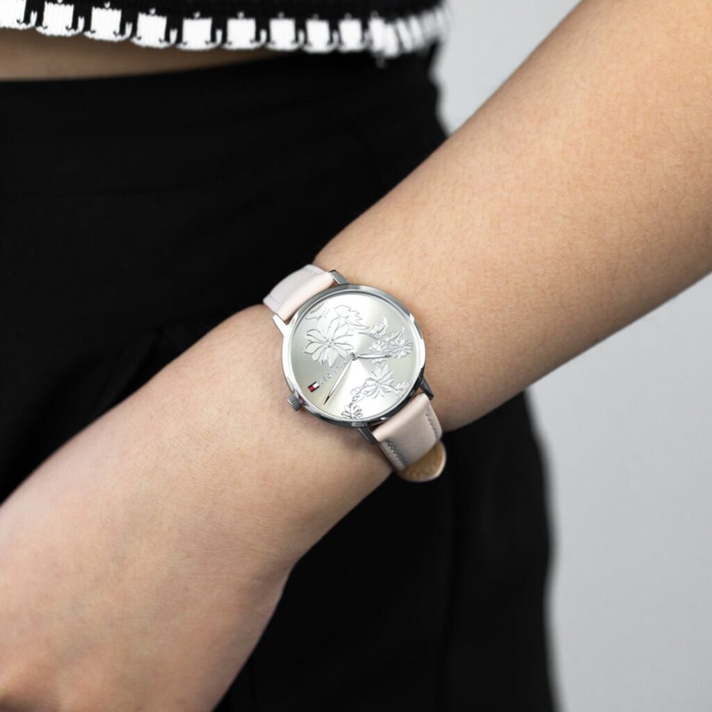 Time blooms with flower power and appeal in this watch that balances subtlety with luxury. The round 35mm polished stainless-Steel and Silver case features a dial with botanical engravings and crystal accents. The smooth Leather strap sports a custom-shaped buckle with iconic Tommy Hilfiger flag Logo detail. Water resistant to 3 ATM/30 meters.