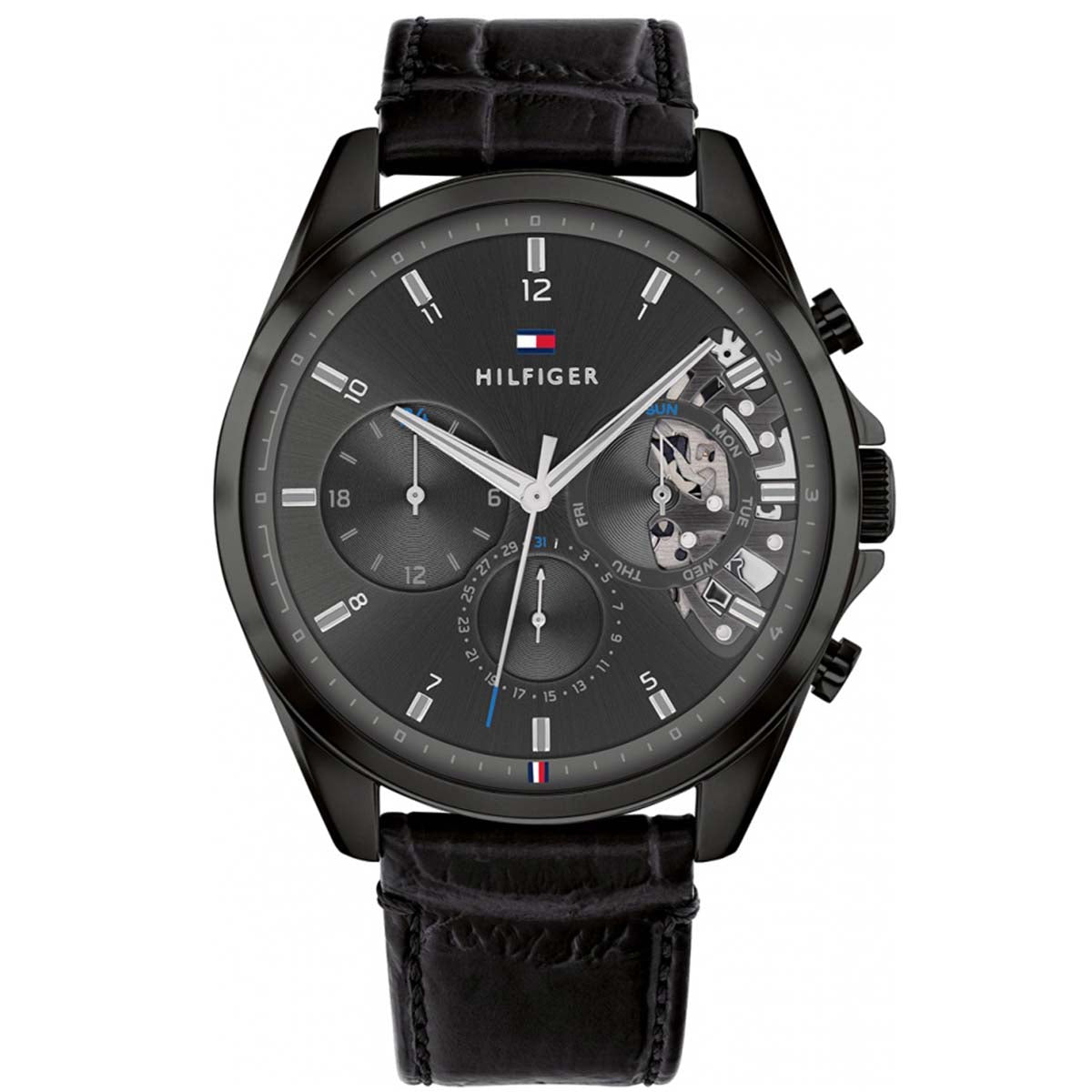 The Men’s Tommy Hilfiger Watch 171.0452 is available to buy from Shade Station. It features a black leather strap, an ip black stainless steel case and has a black with three hand movement, sub dial day/date display dial.Â