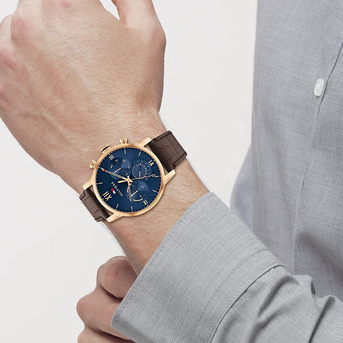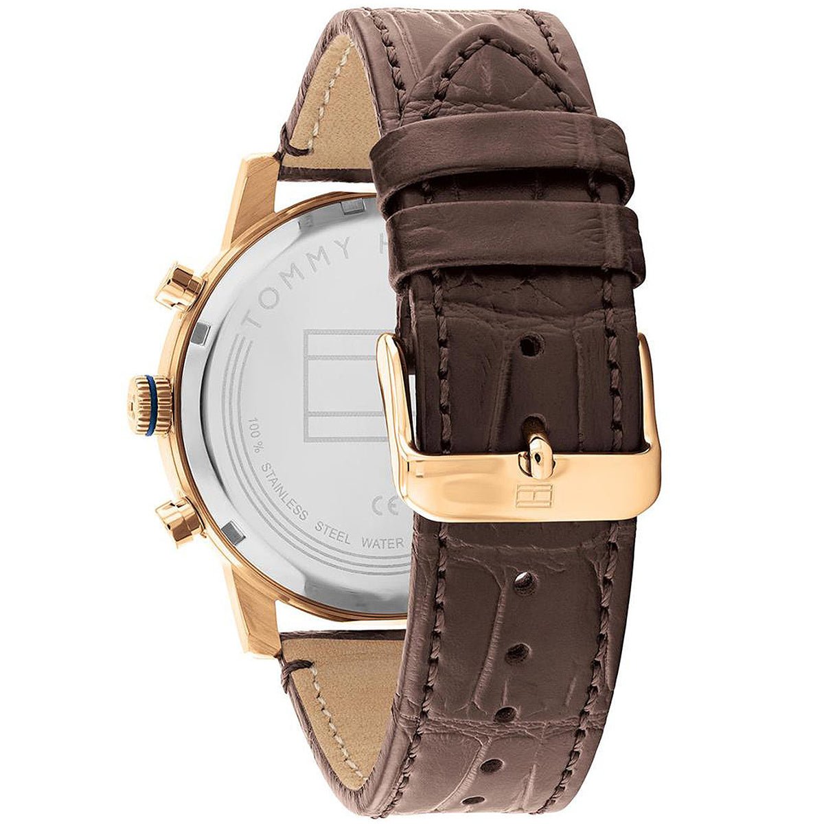 This stylish Tommy Hilfiger Sullivan 179.1933 Brown Leather Watch is an excellent dress piece with high functionality. Set in the classic Hilfiger navy blue and complemented by a gold tone case and brown leather strap, this timepiece is a striking show of colour. Enjoy a sophisticated dial design, with three sundials representing 24-hour time, date and day.