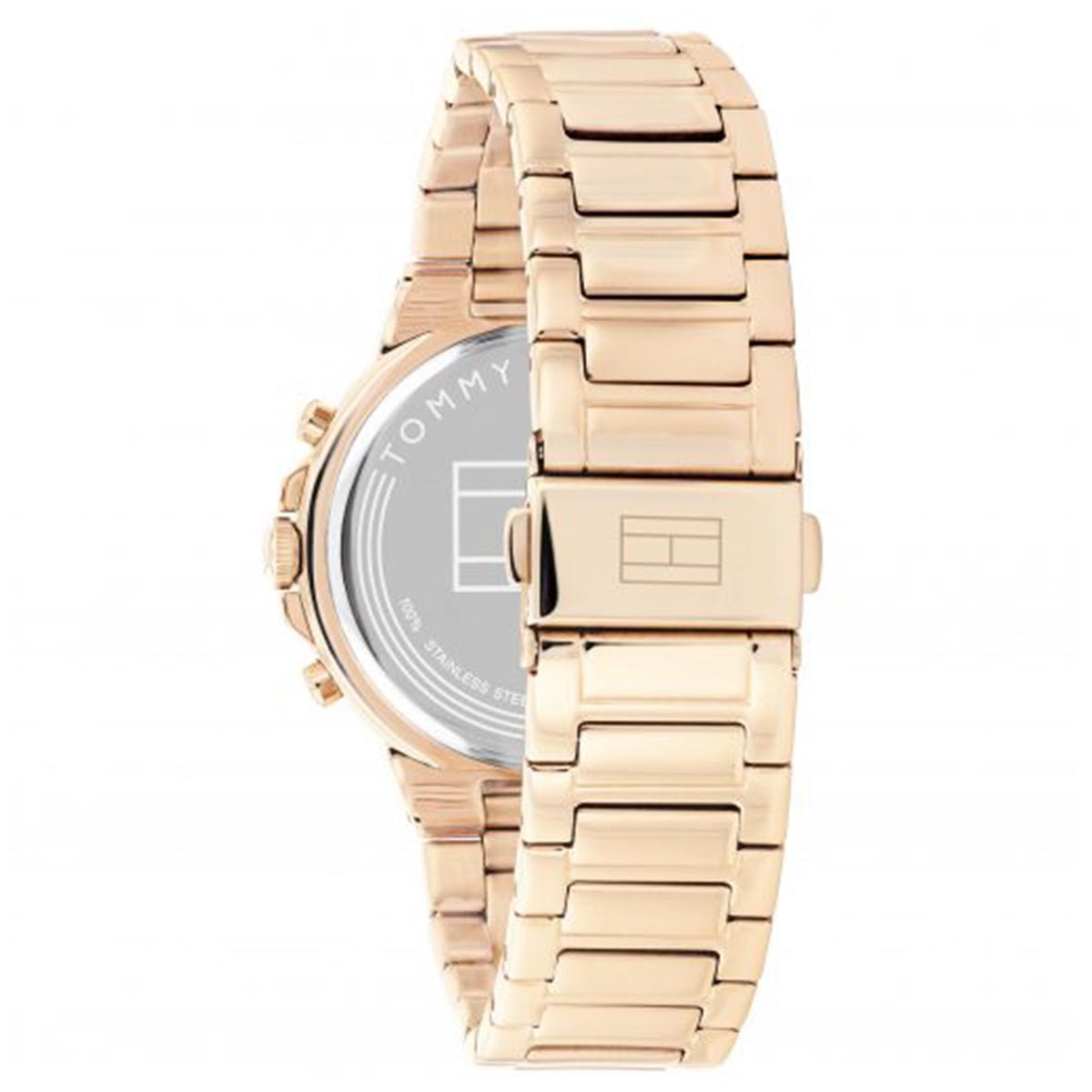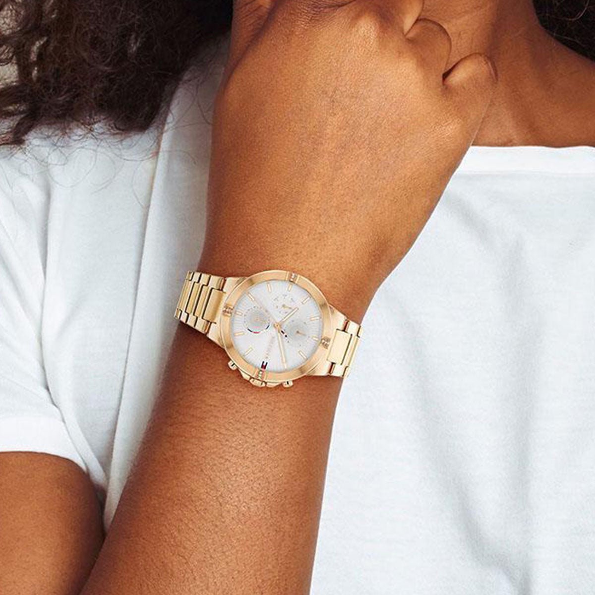 Sporty with an attitude. This collection features a 38MM case available in stainless steel, carnation gold, and gold plated finishes. Stones in the bezel provide an elegant twist on this sporty style. A fan textured dial with iconic elements is paired with integrated and brushed bracelets and silicone straps. 5 ATM/ 50 Meters.