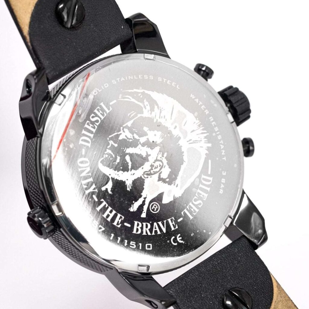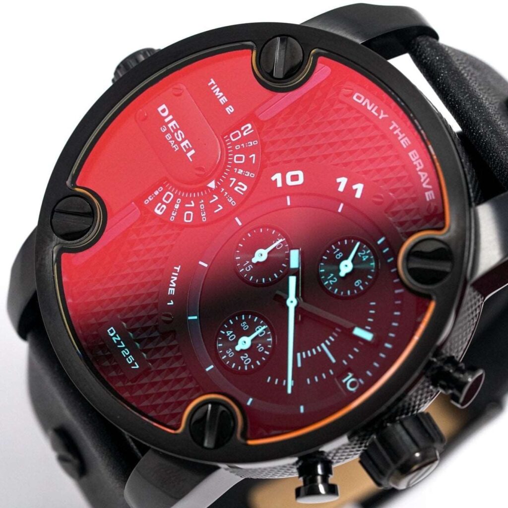 Diesel DZ7257: 51mm stainless steel case, black dial, dual time zone display, chronograph functionality, quartz movement, 30m water resistance. Bold and versatile design for any occasion. This striking timepiece exemplifies Diesel’s unique and rugged style, making it a standout accessory for both casual and formal wear.