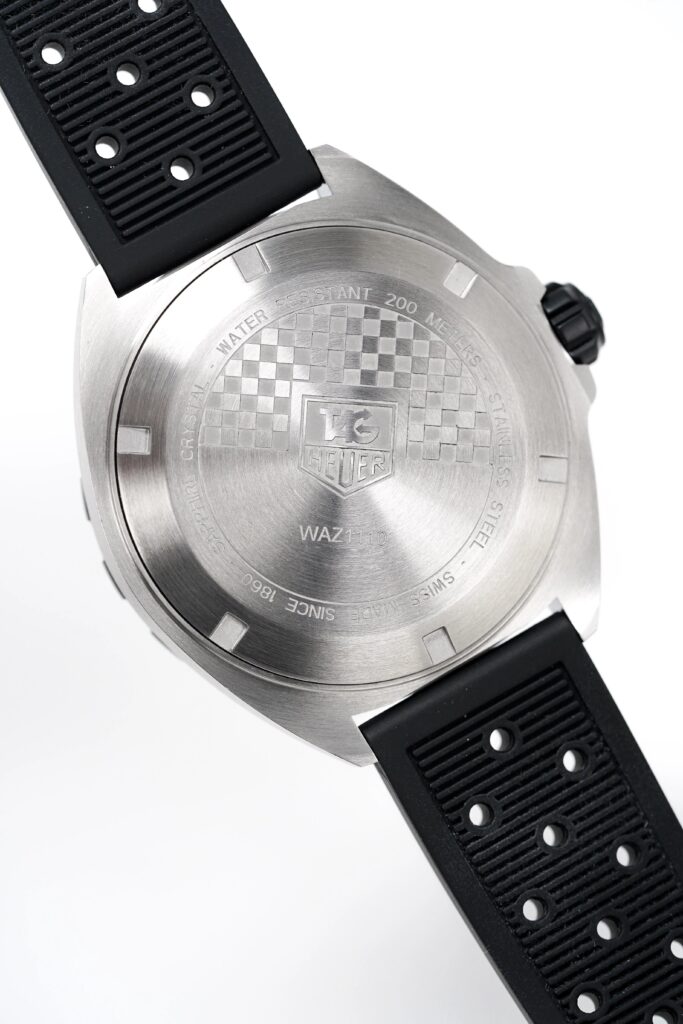 This stunning TAG Heuer Formula 1 watch for men houses one of the brand’s famous quartz movements, considered one of the most reliable and accurate calibres in Switzerland promising an almost perfect precision with a variation of only a few seconds per month. The movement is kept hidden within the fine brushed 41mm stainless steel case and closed case back which is beautifully decorated with a special Formula 1 engraving. Fitted to the case is a sporty black PVD coated unidirectional turning bezel with 60 minute scale, screw down crown and special anti-reflective sapphire crystal glass renowned for its scratch resistance and legibility. The dial of this TAG Heuer Formula 1 Quartz watch is striking thanks to its smooth black finish, sleek steel hands and rhodium plated indexes coated in glow in the dark Superluminova. To complete the sporty look of this men’s TAG watch, a perforated black rubber strap is added alongside a classic stainless steel pin buckle.