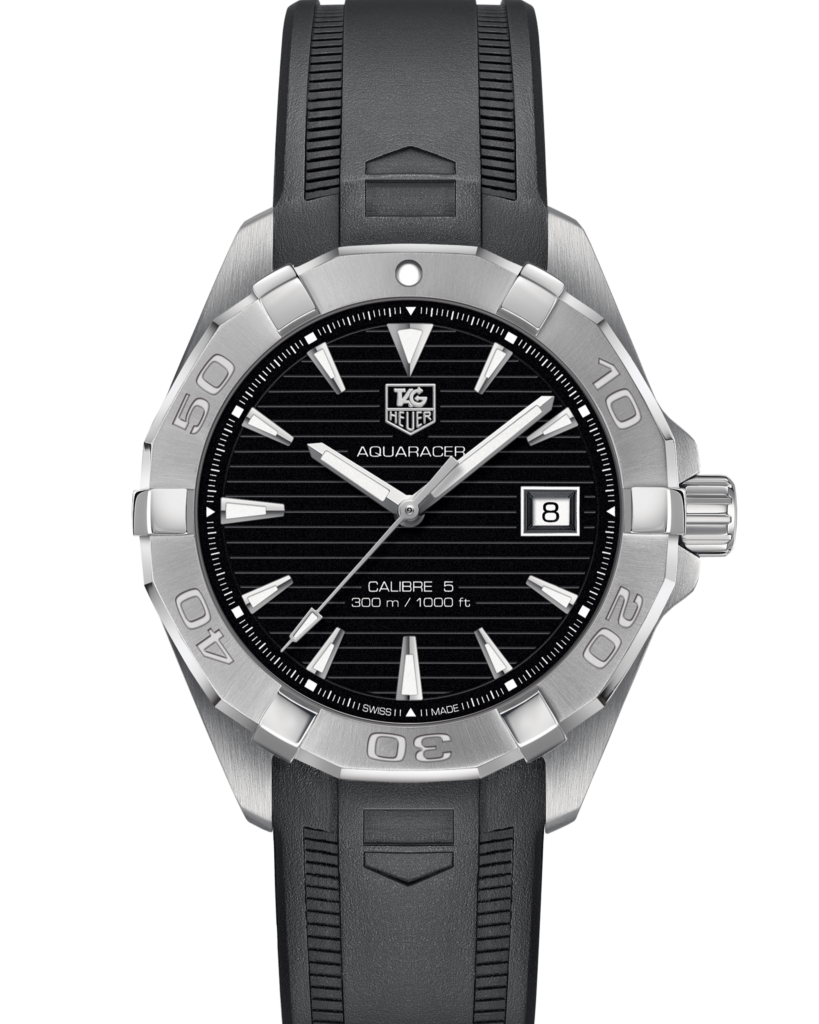 - 潜水表,配有拉丝不锈钢数字表圈和黑色罗纹表盘,并设有日期显示窗。