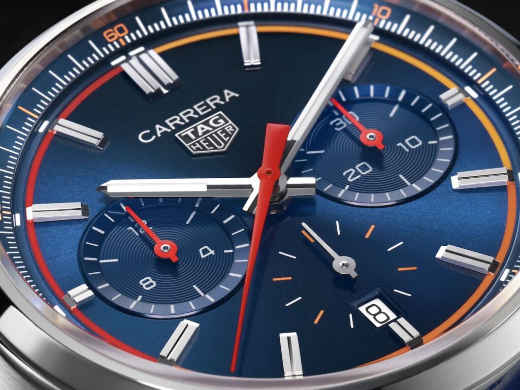 自1963年以来,TAG Heuer Carrera系列腕表一直是运动经典之作。这一经典系列以其卓越的精准度和可靠性著称,由杰克·豪雅(Jack Heuer)设计,其灵感源自20世纪50年代墨西哥街头激动人心却又危机四伏的卡雷拉泛美公路拉力赛。这款TAG Heuer Carrera计时腕表(型号CBN201D.FC6543)以其42毫米精钢表壳和饰有醒目橙色点缀的亮蓝色表盘,完美诠释了赛车运动的精神。腕表配备3点钟位置的30分钟计时盘、6点钟位置的小秒针以及9点钟位置的12小时计时盘。两个计时盘均采用橙色指针,而6点钟位置的小秒针表盘(带白色日期显示窗)则饰有橙色条纹。这款男士TAG Heuer Carrera腕表配备深橙色四分之一秒计时指针,与旭日纹蓝色表盘形成鲜明对比,表盘上方覆以防刮蓝宝石水晶玻璃。表壳内侧也采用相同材质,透过表壳内侧,可以欣赏到机芯HEUER02的精妙运作。